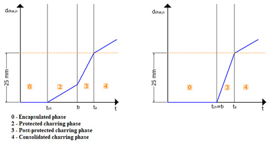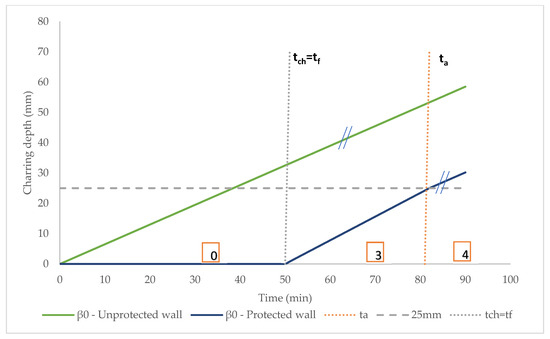 For surfaces protected by fire protection panels, it should be considered that the onset of charring is delayed until a certain time (tch). In this research, it can be observed that tch is 51 min. According to EN 1995-1-2 [11], charring can start before the fire protection is removed, but at a lower charring rate than the rates given in EC5, until the time of failure of the fire protection (tf). The characteristic stages of charring are shown in Figure 18.