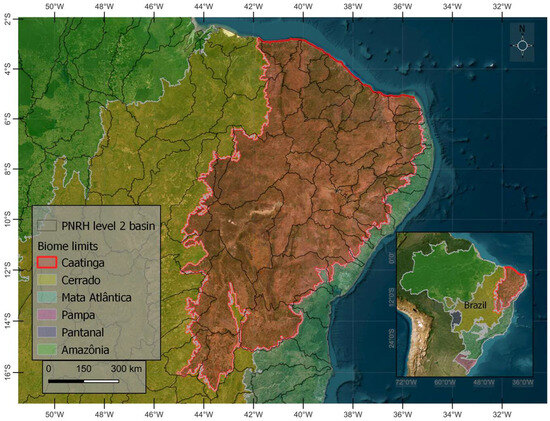 The Caatinga biome covers an area of approximately 86.3 million hectares, accounting for about 10% of Brazil’s total land area. It is situated in the northeastern region of the country, extending from 3° to 17° S in latitude and from 35° to 45° W in longitude (Figure 1). Geographically, the Caatinga is bordered to the east by “Tropical Moist Broadleaf Forests” [47], corresponding to the Atlantic Forest biome. To the west, it transitions into the Cerrado biome, marked by “Tropical Grasslands, Savannas, and Shrublands”, though in the northwest, it also contains a portion of “Tropical Moist Broadleaf Forests” [47]. This ecological gradient emphasizes the transitional nature of the Caatinga, which lies between more humid eastern ecosystems and the drier savannas and shrublands to the west [48].