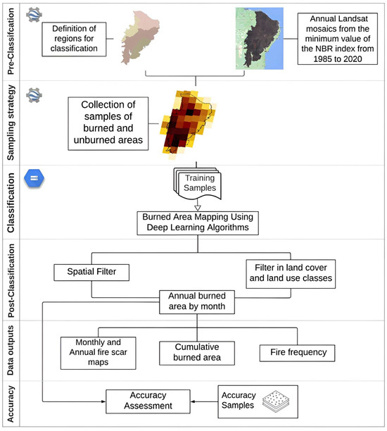 The methodology for mapping monthly burned areas across the Caatinga followed a six-step process. Initially, classification regions were defined by biome. Annual high-quality Landsat mosaics were then constructed, preprocessed using Google Earth Engine. Training samples of spectral signatures for both burned and unburned areas were collected from the mosaics, with results exported to a Google Cloud Storage Bucket. A deep neural network (DNN) prediction model was subsequently trained and developed. Post-classification routines, including the application of masks and spatial filters, were used to refine the classification outputs. Finally, an accuracy assessment was conducted to evaluate model performance. The trained DNN models were applied to process burn scar mapping and produce a comprehensive dataset of monthly burned areas across Brazil from 1985 to 2023. The methodological framework for detecting and mapping burned areas within the Caatinga biome is illustrated in Figure 2.