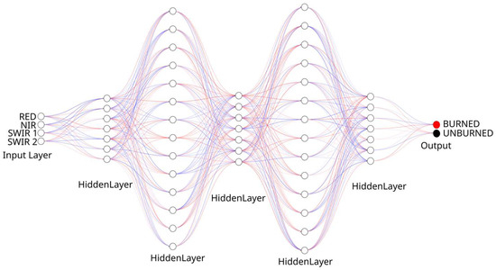 The model has three main layers: input, hidden, and output layers, where each neuron in a layer is connected to every neuron in the next layer (Figure 3). The input layers used the RED, NIR, SWIR1, and SWIR2 spectral bands. This layer receives the raw data, which is then processed through the hidden layers using weighted sums, biases, and non-linear activation functions, allowing the MLP to capture complex, non-linear relationships. The output layer produces the final predictions; the layers classify the areas as burned or unburned. The network is trained using backpropagation to minimize the error between predicted and actual values.