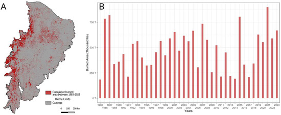 The Caatinga biome, in northeastern Brazil, renowned for its distinct and diverse ecosystems, is particularly vulnerable to wildfires [29,30], a fact that is often exacerbated by human activities [31,32]. Being one of the world’s most imperiled ecosystems, the Caatinga biome is especially at risk of wildfires due to widespread deforestation, as well as intensive agricultural and livestock activities [29,33]. This highlights the pressing need for improved fire management and environmental conservation measures in Brazil. Therefore, it is imperative to gain a comprehensive understanding of the spatial and temporal dynamics of fire in the Caatinga [34] to support effective fire management and conservation strategies in this ecologically vital region.
