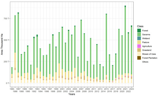 The annual distribution of burned areas by land use and land cover types in the Caatinga biome from 1985 to 2023 is presented in Figure 6. This chart provides valuable insights into the dynamics of fire occurrence across different land cover classes over nearly four decades.