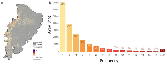 The paper presents the spatial distribution of fire frequency in Brazil from 1985 to 2023, including the corresponding burned area and proportion by frequency class. (A) shows the map of fire frequency throughout the Caatinga biome, while (B) presents the classes of fire frequency by area and their corresponding percentages.