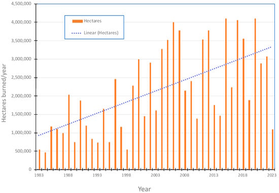 1] by the National Interagency Fire Center (NIFC). While there are substantial year-to-year variations, the general trend is of great concern. Over the 41-year period, the annual loss (in terms of hectares burned) has risen about 3.5-fold.