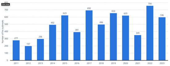 - So, W. Forest fire cases South Korea 2011–2023. Statistics Korea. Statista. 2024. South Korea. Available online: www.statista.com/statistics/1296399/south-korea-forest-fire-outbreaks/ (accessed on 2 September 2024).