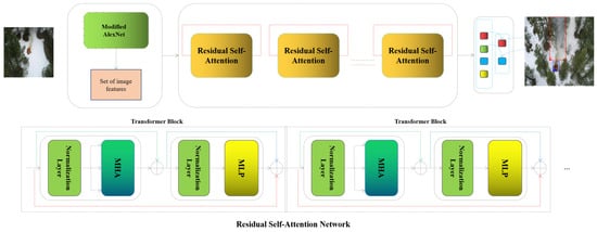 12]. The innovation lies in the redesigned AlexNet backbone, which incorporates residual depthwise separable convolution blocks to reduce computational load while enhancing feature extraction. Additionally, a novel residual self-attention mechanism ensures robust feature representation, mitigating convergence issues commonly associated with deep transformer networks. By integrating these modifications, the model achieves superior performance in detecting and localizing fire elements across varied and complex aerial imagery.