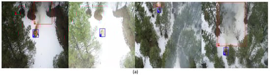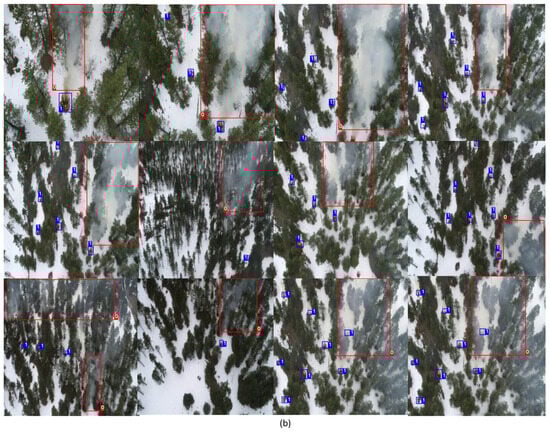 Figure 6 shows the effectiveness of the modified MITI-DETR model for fire detection, particularly in aerial imagery captured by drones. The red bounding boxes clearly highlight regions where the model has detected smoke within the dense forest environment. These detections are precise and well-aligned with the ground truth annotations, showcasing the capability of the model to accurately identify areas of interest, despite the complex background of trees, snow, and varying lighting conditions. Moreover, the presence of multiple blue annotations within the images suggests that the model is also performing localization and classification tasks, possibly distinguishing between fire and smoke. The distribution of the bounding boxes across various regions demonstrates the robustness of the model in detecting fire across different perspectives and scales, which is crucial in aerial fire detection where the distance between the camera and the target may vary significantly.