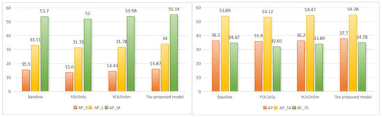 of 54.78, demonstrating its superior accuracy in detecting objects with more overlap between predicted and ground truth boxes. For the stricter 75% IoU threshold AP₇₅, the baseline model records 34.67, YOLOv5s drops to 32.01, and YOLOv5m scores 33.89. The proposed model, once again, leads with 34.78, reflecting its better precision when bounding box predictions need to closely match ground truth. For the detection of small objects
