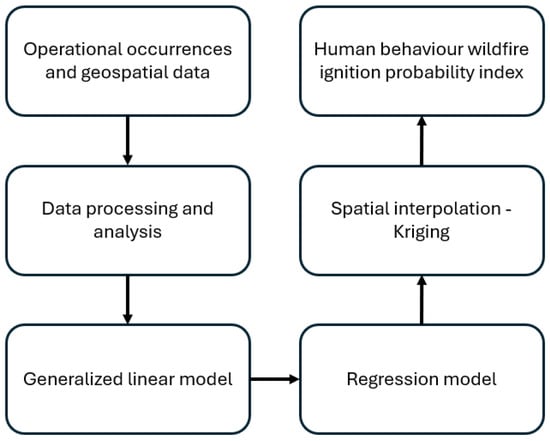 The methodology was based on six main stages. First, variables were chosen and the data were collected. Their multicollinearity was then tested using various statistical tests. A Generalized Linear Model was employed to model ignition occurrence and generate the regression model. Then, the regression model was applied to mainland Portugal and the spatial distribution of estimated ignitions was obtained. Finally, after validating the results, the human behavior wildfire ignition probability index was obtained.
