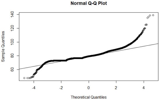 The p-value 2.2 × 10−16 from the non-parametric Kolmogorov–Smirnov test is lower than the significance level of 0.05, indicating a significant disparity between the distribution of the ignition sample and the normal distribution used as a reference. The absence of normal distribution in the data points allowed us to implement the GLM with more certainty since this type of model is indicated for non-normal distribution data.