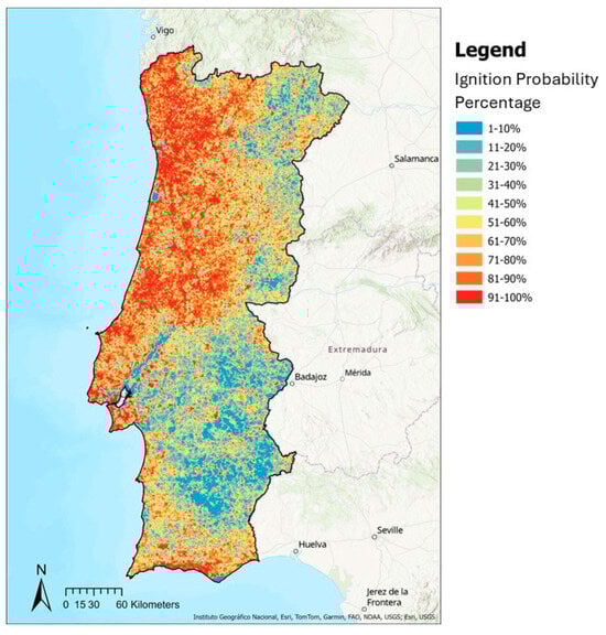 The interpolation methods and probability-mapping techniques applied to the ICNF ignition data for 2021 and 2022 demonstrated strong reliability between predicted and observed ignitions. The analysis highlighted high ignition risks in forested areas near residential roads while higher population densities showed fewer ignitions, likely due to urbanization reducing vegetation and enhancing fire prevention measures. However, inland districts exhibited lower model performance due to unique landscape and socio-economic characteristics.