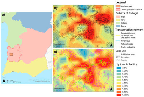 Figure 6). This region is predominantly characterized by extensive agricultural and forestry activities. The analysis revealed that the highest simulated probability of ignition due to human activities is concentrated in forested areas near urban zones and along residential roads.