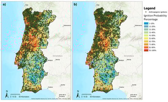 27]. This population distribution is related to the simulated and registered human-caused fire ignitions. Despite the high simulated ignition probability indices near the cities of Lisbon, Cascais, and Porto, these areas did not experience a correspondingly high number of fire ignitions. This is explained by the lack of forested areas near the urban boundaries of these highly populated cities, reducing the availability of fuel for fires.