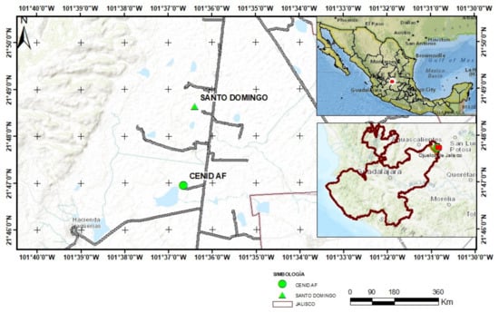 The experimental area is located in the Llanos de Ojuelos, Jalisco (21°46′52.25″ N, 101°36′29.56″ W, 2240 m above sea level) in central Mexico (Figure 1). The average annual precipitation is 424 mm, with rainfall occurring between July and September, and the average annual temperature is 18 °C. The topography is nearly flat, with a slope of less than 3%. The soils are shallow, of the haplic xerosol type, with a medium texture (sandy loam) and a duric phase (tepetate) at a depth of 50 to 100 cm [].