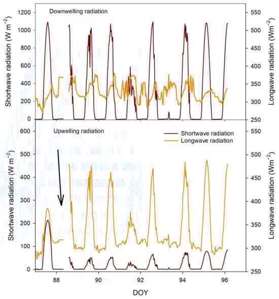 Time series of shortwave (285–3000 nm) and longwave radiation (4500–42,000 nm) at the study site one day before the burn (arrow indicates the day of the burn) and days after it. The upper panel shows downwelling radiation, while the lower panel presents upwelling radiation. Day of year (DOY).