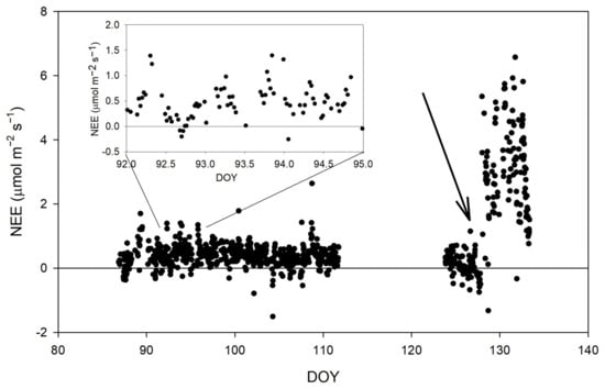 Net ecosystem carbon exchange (NEE) was monitored using the eddy covariance method [] in the prescribed burn area. NEE represents the sum of CO2 uptake by plants through photosynthesis and CO2 release to the atmosphere from soil microorganisms (heterotrophic respiration) and plant respiration (autotrophic respiration from roots and aboveground biomass). The eddy covariance system measures the balance between these fluxes. To determine the contribution of photosynthesis and respiration, flux partitioning methods [] are required. However, when all vegetation is in senescence or during nighttime (when no photosynthesis occurs), the measured fluxes come solely from respiration. The measurements were conducted during the same period as the soil respiration measurements, which were used as reference data to determine grassland productivity during the growing season. The data were processed according to standard procedures, including spike removal, coordinate rotation, time delay correction, WPL correction for air density fluctuations, stationarity checks, and turbulence generation []. A four-component net radiation sensor (NR01, Huksefflux, Delft, The Netherlands) was mounted in the tower of the eddy covariance for monitoring changes in albedo.