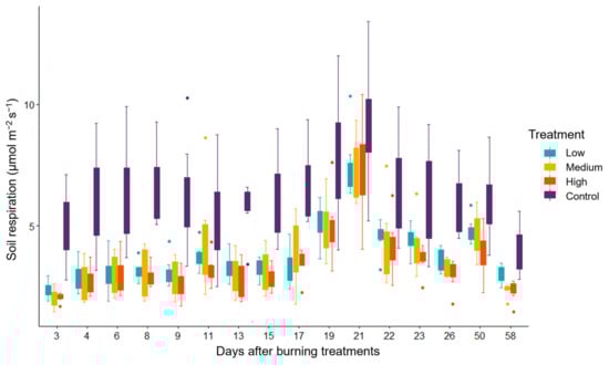 In all three fire intensity treatments and the control, an increase in respiration rate was observed 21 days after the start of measurements, which coincided with a period of rain that increased soil moisture. At this time, there was a total precipitation of 278.8 mm, slightly over 50% of the region’s annual precipitation (Figure 6).