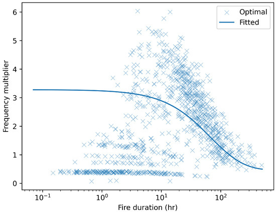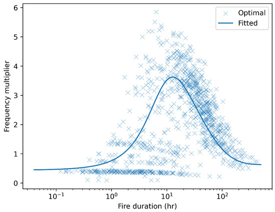 Figure 4 displays the fitted frequency multipliers: in summary, importance sampling in this case will increase the sampling frequency of medium-duration fires at the expense of low-duration and high-duration fires.