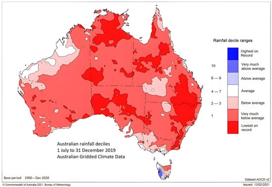 - Bureau of Meteorology. Six-Monthly Rainfall Deciles for Australia 01/07/2019-31/12/2019. Available online: http://www.bom.gov.au/climate/maps/rainfall/?variable=rainfall&map=decile&period=6month®ion=nat&year=2019&month=12&day=31 (accessed on 12 April 2024).