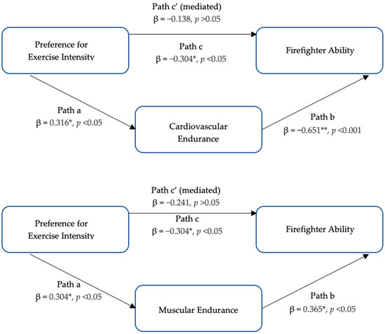 Week 1 Mediation Model (see Figure 2): Separate simple linear regressions revealed significant associations for preference for exercise intensity and fitness (cardiovascular and muscular; path a, R2 = 0.112, R2 = 0.107), fitness (cardiovascular and muscular) and firefighter ability (path b, R2 = 0.417, R2 = 0.191), and preference and firefighter ability (path c, R2 = 0.088), meeting the mediating relationship requirements. When fitness (cardiovascular and muscular) was separately applied as a mediating variable, the impact of the association between preference and firefighter ability (path c’) was reduced (beta weight decline of 21.2% and 12.5%, respectively) and was no longer a significant factor (p = 0.505, p = 0.242).