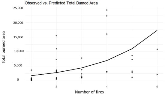 Comparison of observed versus predicted total burned area in relation to the number of fires, using the generalized linear model (GLM) with the gamma family.