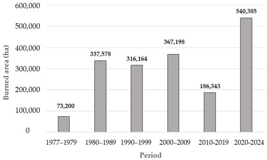 Greece is one of the European countries with high fire hazard [34], and previous studies have identified Attica as one of the regions exposed to the highest fire risk [35]. Forest fires in Greece occur mainly in middle and low latitudes, as Kontoes et al. [15] reported for the period 1984–2021. During this period, the total BA for Attica was 108,072.32 ha, representing 28% of its total area and 12.3% of the areas burned in the entire country [10]. The years with the more severe events were those of 2000, 2007, and 2021 in which 85,015, 199,004 and 118,540 ha were burned, respectively, in the entire country, with the southern and more arid regions of the country showing greater susceptibility to wildfires than the northern and wetter regions [15]. Our results are in accordance with these findings, since 171,114 ha were burned during the study period of 1977–2024, while the periods with the most severe wildfires were those of 2000–2009 and 2020–2024 in which 36,719 and 54,038 ha were burned, respectively, only in Attica. The total burned area for the period 2010–2019 was relatively low, although the climatic parameters did not differ significantly compared to the other five distinct periods. In contrast, in the rest of the country some devastating wildfires took place, as was the case of the wildfire in Chios in 2012, when more than 14,800 ha were burned [36].