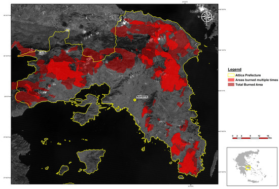 Delineation of the burned areas in Attica Prefecture over the entire study period, along with the areas burned multiple times. Only fires larger than 150 hectares are included. Data Sources: Landsat 8 / USGS, RGB: Gray Scale. Resolution: 30 m. https://earthexplorer.usgs.gov/.