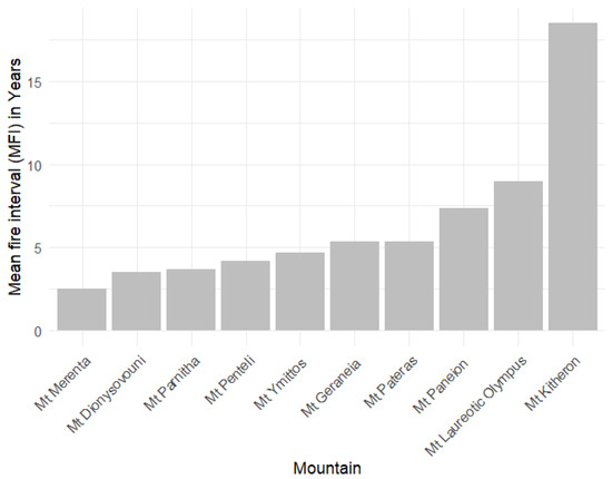 Figure 3 presents the spatial distribution of the total burned areas (BAs) in Attica, along with the areas burned multiple times. The total BA corresponds to 182,086.8 ha. Given that the area of Attica Prefecture is 380,800 ha, the area burned during the study period represents nearly half of the area of the prefecture (47.82%). Attica experiences frequent wildfires, but the fire frequency varies across the different parts of the prefecture. Out of the total of 108 recorded fire events, 78 were either exclusively or primarily located in the main mountain ranges. Among these, both the number of fires and the fire interval differed, varying from 2.5 years in lower hills such as Mt. Merenta to 18.5 years in Mt. Kitheron. However, elevation does not fully explain the MFI, as Attica’s highest and largest mountain, Mt. Parnitha, is frequently burned, with an MFI of 4 years (Figure 4). Fire incidents did not typically occur on recently burned areas, providing further support for the use of a time window of 15 years to identify areas burned twice or more. The variation observed in the mean fire interval across mountains appears to be influenced by the dominant vegetation, with more frequent fires occurring in mountains that still host Pinus halepensis forests (see next paragraph), such as the foothills of Mt. Parnitha.
