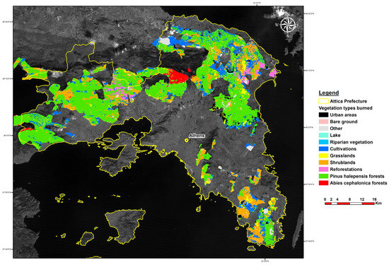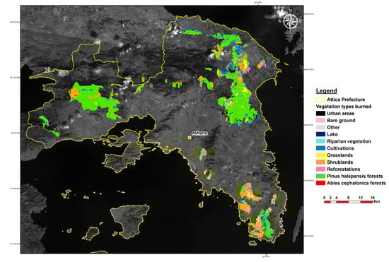 The aim of this study was to investigate temporal changes in fire regimes over Attica, a prefecture of Greece where Athens, the capital of Greece is situated. Attica is the most densely populated region of Greece, hosting half of the population of the country. Urban expansion often takes place at the expense of forested or shrubland areas, sometimes following intentional fires [11,12], even within protected areas [13]. As a highly populated region, Attica is particularly vulnerable to fire risk under future climate scenarios [14]. In the current study, fire events were studied not only numerically but also by mapping their extent through time, with the use of satellite images. Only few other studies have been published which report on fire events in Attica over a certain period of time (e.g., [14,15]), but none has reported on their spatial arrangement and the types of vegetation burned. Such studies are particularly important for regions such as Attica, where wildfires may result in numerous fatalities and severe consequences to the local natural and built environments, as was the case of Mati wildfire in Eastern Attica in 2018 [16].