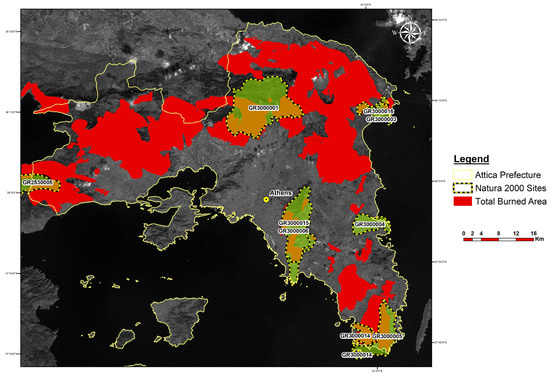Several parts of the burned mountainous regions fall within protected areas belonging to the Natura 2000 network. Figure 7 depicts the areas designated as Natura 2000 sites in Attica as compared to the total BA over the entire study period.
