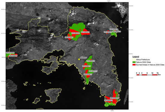 Natura 2000 sites in Attica cover an area of 40,340 ha, a great portion of which was burned during the study period, amounting to 15,447 ha, a percentage of 38.9% (Figure 8). This is important both for the total area burned but also for the protected habitats and species that might have been affected by the wildfires.