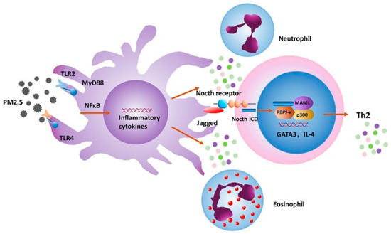 Exposure to smoke from wildfires and air pollution stemming from traffic has been linked to the activation of aryl hydrocarbon receptors, toll-like receptors and the signaling pathway of nuclear factor (NF)-ĸB. This exposure also leads to an increase in pro-inflammatory cytokines, including IL-22 [6]. Firefighters exhibit elevated levels of IL-6 and IL-12, alongside a reduction in IL-10, in their serum 12 h following exposure to a wildfire [36]. The correlation between environmental pollutants and the activation of the NLRP3 inflammasome, along with the subsequent induction of pyroptosis, has been linked to a variety of diseases [37,38]. Perfluoroalkyl substance pollutants, for instance, have been demonstrated to stimulate the innate immune response via the absence of melanoma 2 (AIM2) inflammasome [39]. In a separate investigation, it was demonstrated that micro- and nanoplastics, which are becoming more prevalent in the atmosphere, can activate the inflammasome [40].