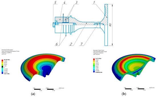 The design consists of a disk-shaped emitter performing bending oscillations (Figure 1, position 1) and a piezoelectric transducer consisting of a radiating pad, in this case an oscillation concentrator (Figure 1, position 2), piezoceramic rings (Figure 1, position 3) and a reflecting pad (Figure 1, position 4). The disk oscillates in the second bending-ring oscillation mode. At the same time, in order to reduce mechanical stresses and increase the thickness of the central and outer ring zone to optimal dimensions, the radial transition was increased to dimensions sufficient to ensure the design of the emitter without step changes in the thickness of the disk [].