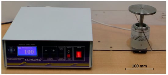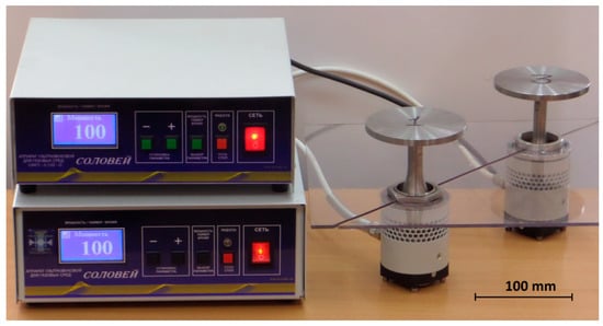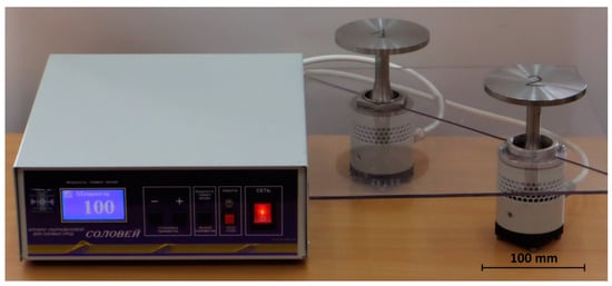 A dual emitter was used to create acoustic fields with a complex structure and increase the power of acoustic impact. It consisted of two disk emitters (Emitter 1 and Emitter 2) powered by one generator with synchronization of frequency (22,785 Hz) and phase of disk oscillations (version 2). Compensation for the relative change in the resonant frequency of emitters (relative to each other) was carried out electronically by means of a tunable choke installed in the power supply circuit of each emitter. During operation, the difference in emitter frequencies did not exceed ± 2 Hz. A photograph of the generator with two emitters is shown in Figure 3.