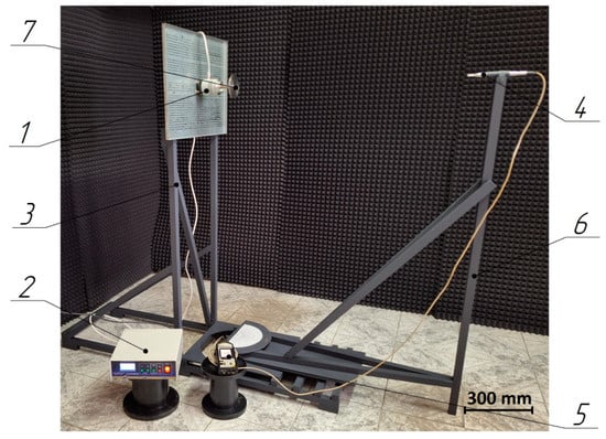 Stand for measuring the directional pattern of ultrasonic emitters. 1—Ultrasonic disk emitter, 2—electronic generator; 3—emitter stand, 4—microphone; 5—noise meter measuring unit; 6—microphone stand; 7—microphone direction point.