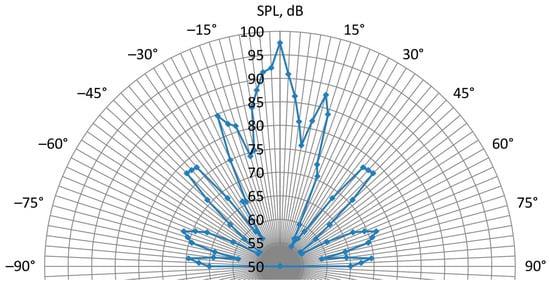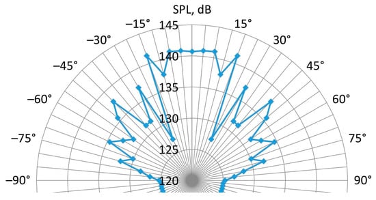 When acting with one emitter, it was found that the opening angle of the main lobe of the directivity pattern was 20°, the sound pressure level at a distance of one meter was 141 dB (Figure 7).