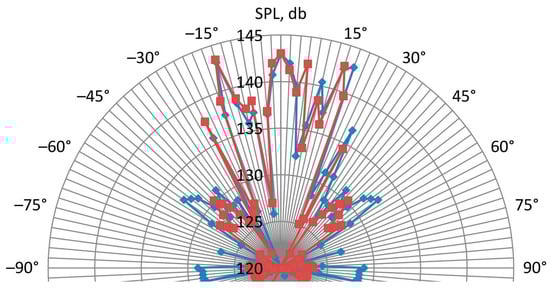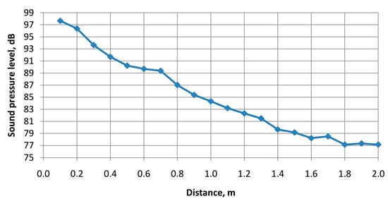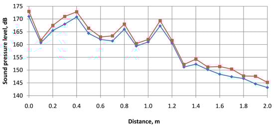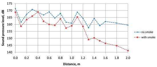 It follows from Figure 12 that low-frequency oscillations are attenuated less in a smoky environment. With a lower initial value, the relative decrease in SPL at a distance of 1 m and 2 m from the emitters is 10 dB less than for ultrasonic frequencies. Thus, at a distance of 1 m from the radiating surface of the ultrasonic emitters, the sound pressure intensity was 84.1 dB, and at a distance of 2 m it was 77.8 dB.