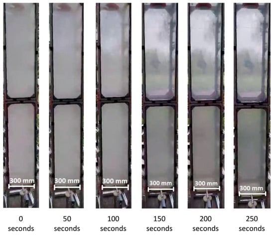 Initially, the chamber is filled with smoke from burning sawdust (0 s). Ultrasonic action on the smoke is performed. Under the action of the acoustic field, the smoke particles come together and begin to unite into agglomerates with further precipitation under the action of gravitational forces. The process of acoustic coagulation begins in the immediate vicinity of the ultrasonic emitter, i.e., first, there is an effect on the smoke particles located in the upper quarter of the chamber. After 50 s of exposure, light in the upper quarter of the chamber is observed. Then, acoustic coagulation spreads along the chamber and, even after 100 s of ultrasonic action, almost complete precipitation of smoke particles occurs in the upper half of the chamber and acoustic coagulation begins in the lower half of the chamber. After 150–200 s of ultrasonic action, the precipitation of the smoke particles occurred in almost the entire chamber. Once again, it should be noted that during the experiments the smoke generator was on, thus smoke was entering the chamber constantly.