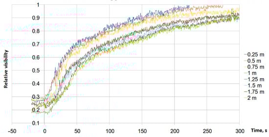 Before the experiment, the chamber was filled with smoke to its full height. The moment the ultrasonic action began corresponds to the zero mark on the time axis. It is evident that at the initial moment of time (during the first 50 s) there is a significant increase in visibility in the smoke chamber, up to 0.8 of the visibility in the absence of smoke at a distance of 0.25 m from the emitter. At the same time, at a distance of two meters from the emitter, the relative visibility is no more than 0.6 (the supply of smoke to the smoke chamber did not stop). Visually, this corresponds to the second photograph in Figure 13, where a significant gradient of smoke density is observed as the distance from the emitter located at the upper end of the chamber increases.