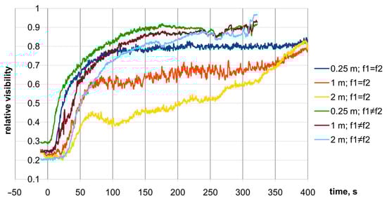 Such acoustic fields can be created using two emitters. The emitters must operate synchronously at one frequency or at two close frequencies to initiate the rotational motion of agglomerates (for an additional increase in the collision cross-section of smoke particles) and the additional formation of acoustic beats (for subsequent agglomeration and final sedimentation of large particles and primary agglomerates of sizes from 1 μm). The smoke flow rate was 50 L/min. Otherwise, the conditions of the experiment were similar to the previous one. The dependencies of the change in relative visibility for each type of ultrasonic action (at one frequency and different frequencies) are shown in Figure 15.