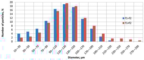 To assess the influence of rotational motion and acoustic beats on the shape and size of agglomerates, samples were collected by catching the formed agglomerates at a distance of 2 m from the emitters. The agglomerates were caught on a microscope slide covered with a layer of immersion liquid. A histogram of the distribution of agglomerate sizes (the agglomerate diameter was defined as the diameter of a circle with an area equal to the area of the agglomerate), obtained with equal-frequency and different-frequency ultrasonic exposure, is shown in Figure 16.