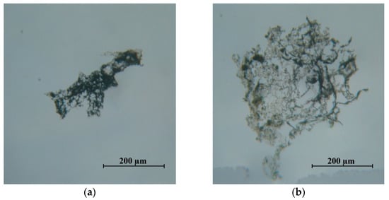 The histogram in Figure 16 shows that the sizes of the agglomerates obtained with equal-frequency exposure are shifted toward smaller values compared to multi-frequency exposure. The average diameter of agglomerates is 115 µm. In the case of dual-frequency exposure, the average size of agglomerates is somewhat larger and equals 128 µm. Also, with multi-frequency ultrasonic exposure, agglomerates of sizes greater than 230 µm (up to 290 µm) are formed, which are not observed with equal-frequency ultrasonic exposure. Since the exposure time and sound pressure level were the same for both cases, the larger average size of the agglomerates may be due to the increased frequency of collisions of smoke particles and agglomerates with each other. Figure 17 shows an example of photographs of smoke particle agglomerates obtained using the Lomo Mikmed−6 microscope.