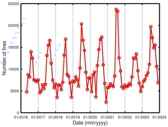 - Tyukavina, A.; Potapov, P.; Hansen, M.C.; Pickens, A.H.; Stehman, S.V.; Turubanova, S.; Parker, D.; Zalles, V.; Lima, A.; Kommareddy, I.; et al. Global Trends of Forest Loss Due to Fire from 2001 to 2019. Front. Remote Sens. 2022, 3, 825190. [Google Scholar] [CrossRef]