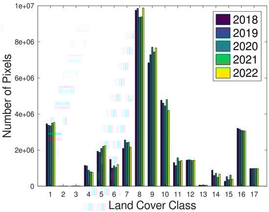 - Sulla-Menashe, D.; Friedl, M.A. User Guide to Collection 6 MODIS Land Cover (MCD12Q1 and MCD12C1) Product. User Guides. NASA EOSDIS Land Process DAAC 2018, 6, 1–18. [Google Scholar]