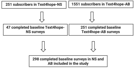 This study was conducted in two Canadian provinces, Alberta and Nova Scotia, with a total population of 5,751,004, according to Statistics Canada 2023 []. A cross-sectional survey was used to collect the data from the residents in the two provinces using a self-administered questionnaire which was sent via REDCap []. The survey was part of two mental health support services Text4Hope Alberta (Text4Hope-AB) and Text4Hope Nova Scotia (Text4Hope-NS). The services have been provided to support the mental health of the residents in the two provinces during the attack of wildfire starting in March 2023. A daily supportive text message was sent for six consecutive months and was crafted within the cognitive behavioural therapy concepts. Subscribers can self-enroll by texting “HopeNS” or “HopeAB” to a phone number 393939; subsequently, the subscribers will receive a message confirming their subscription. The supportive text messages are sent once per day at 9 a.m. for six consecutive months. The service is free to end users and has received support from the provincial health authorities and academic institutions in both provinces. No incentives were offered to the subscribers, and responding to the survey was voluntary and not contingent on receiving supportive text messages.