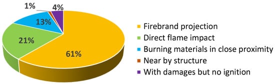 Regarding the type of ignition, 61% of the structures were damaged (partially and totally) due to firebrand propagation, but fires due to flame impact on the structures only accounted for 21%, as depicted in Figure 1. This is according to reports from previous wildfires all from different countries that have been warning for years, and one of the biggest causes of burned houses is not related to direct flame contact. In any case, 21% of houses burned due to direct flame contact, which still presents a challenge in terms of fire resistance, so design guidelines are needed for this type of action.