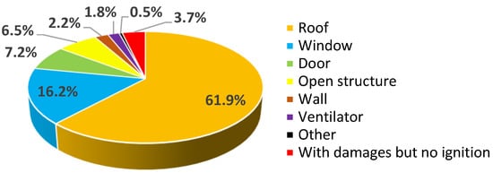As for the location of ignition, about 62% of the fires occurred on the roof, not only due to the existence of vulnerable points, but also due to the strong wind that caused the destruction of the roofs (moved tiles), exposing the interior of the structures. In about 23% of damaged structures, fire started in the windows and doors, as presented in Figure 2. It can be pointed out that the vents (or chimneys) are places where firebrands easily enter, and in 6.5% of cases, this was the place of ignition. In some cases, the structures began to burn on the exterior walls, a fact justified by the existence of cracks or other anomalies that made the structure susceptible to fire. Another conclusion that emerged from these reports [12] was the fact that about half of the fatalities occurred when people were trying to flee their homes, and it was later found that 21 out of the 65 victims had no damage in their own dwellings. This shows the lack of preparation and knowledge of the population on how to react in a wildland fire situation.