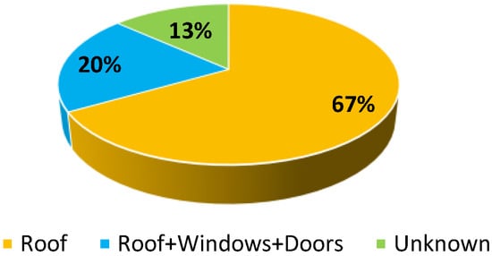 More than 84% of damage was located in exterior elements (roof, window/door, and wall), and if these present any structural functionalities, then they need to be fire resistant. For this study, since dwellings are viewed as a shelter for protection and should not be evacuated, they also require a higher reaction to fire class according to European standards [52,53].