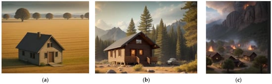 Dwelling exposure classes for wildfire-fireproof design [27]. (a) Dwelling isolated in the plain field without any near trees. (b) Dwelling isolated in the wildland and surrounded by trees. (c) Dwelling located in the WUI, surrounded by trees and buildings.