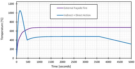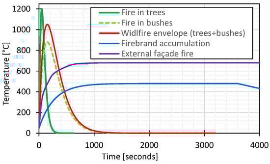 Design temperature vs. time curve due to convection, radiation, and firebrand accumulation or external façade fire, used in class exposure scenario C [27].